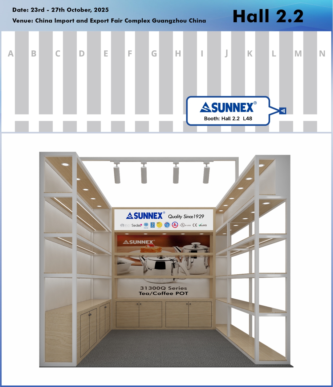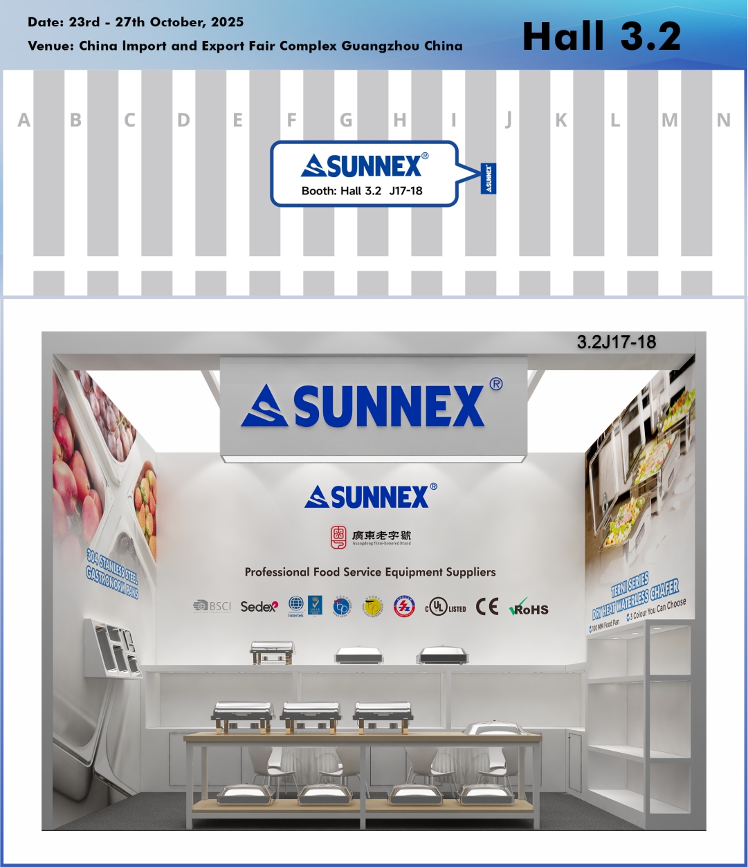 Guangzhou, Kina – oktober 2025 – SUNNEX Century (Shenzhen) Ltd., en ledande tillverkare av premiumbufféartiklar, skavskålar, dryckesautomater och hushållsartiklar, är glada att kunna bjuda in internationella köpare, media och branschfolk att besöka våra montrar på den 138:e Kinas import- och exportmässa (Canton Fair).